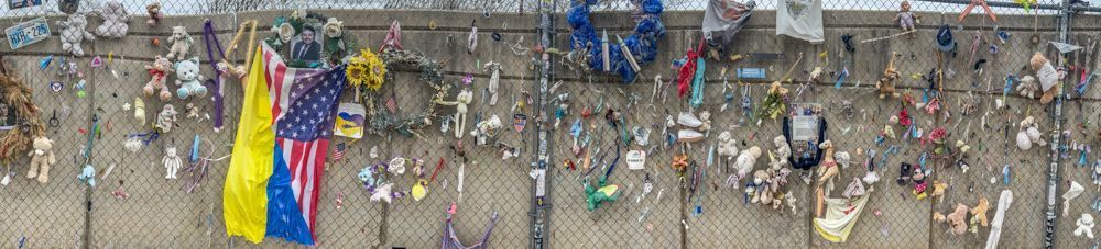 A living memorial on a chain link fence meant to preserve the original footprint of the building.