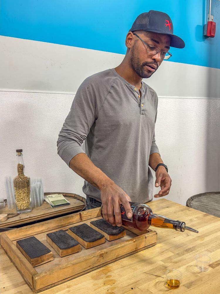 Jason at Still Austin, pouring tastes. The blocks are examples of the char on the inside of the white oak barrels, the glass bottle holds a selection of the starting grains.