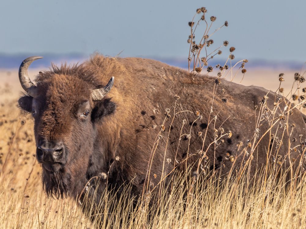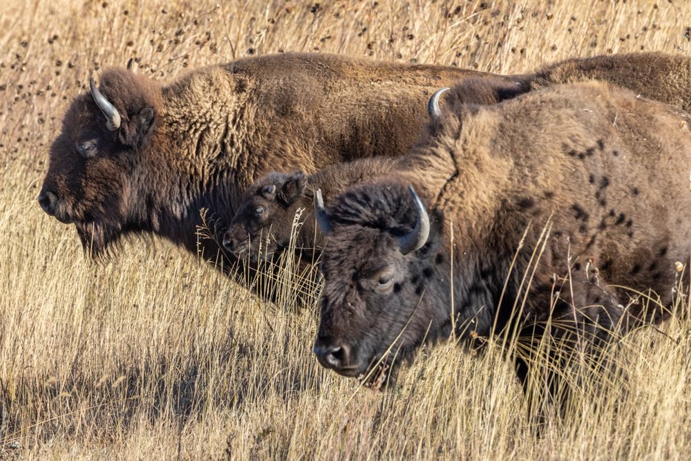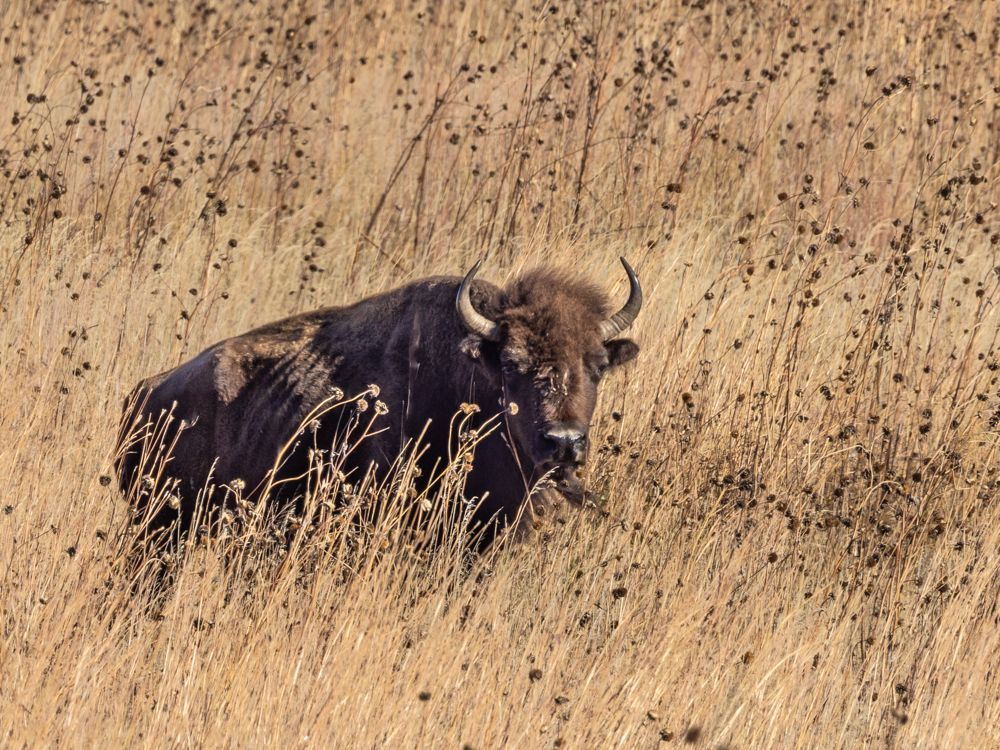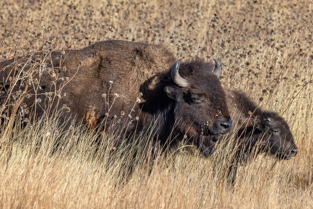 The refuge was a bust, so I drove up the road the the scenic overlook. As I entered the half mile gravel road leading to the top of the hill, there were the bison, a group of a dozen or so, including bulls, cows and calfs. I stopped well away and started shooting standing on the running board of my vehicle. Predictably several cars arrived soon after and, of course, drove right up to the bison so they could shoot with their phones. In my opinion, they were way too close. These bison are obviously used to human presence, but I would not want to tangle with any of them, especially the bulls. On car managed to edge past and then, predictably got stuck trying to come back. Another became impatient and made a 37 point turn to get back to the main road. The third just blocked the road and the view for a while and I had to shoot around them. I will encapsulate the problem as human arrogance and phones. I can only imagine what this area must be like during the summer travel season. I did capture some images of the bison, but even the late afternoon was cloudless and the light was harsh. Hopefully I’ll have some more chances at bison in the next few states.