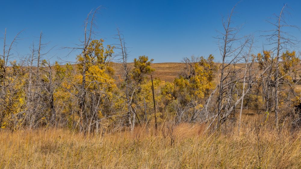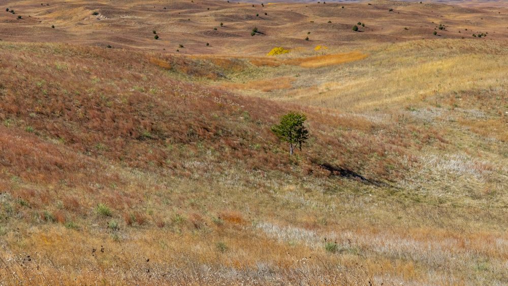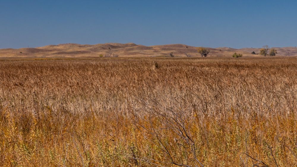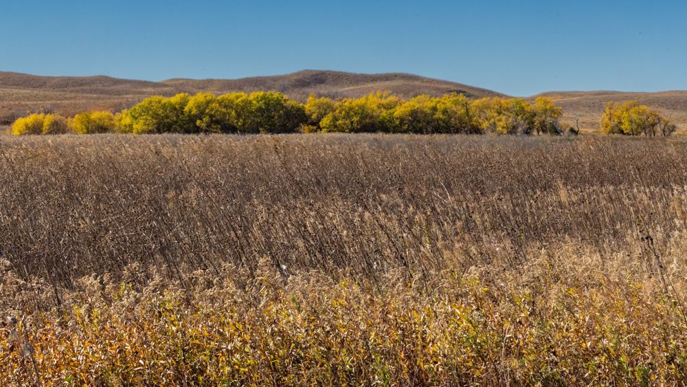 Valentine NWR , which he said housed a pair of trumpeter swans and should also be home to migratory waterfowl. The lake is reached via a 9 mile gravel road that winds through the refuge. While the wildlife was elusive - others confirmed the unexpected dearth of migratory waterfowl - this was more than compensated by the stunning scenery. While stark - hectares of grassland dotted with stands of trees around the many small lakes and streams - the grasses are a complex palette of color and texture.