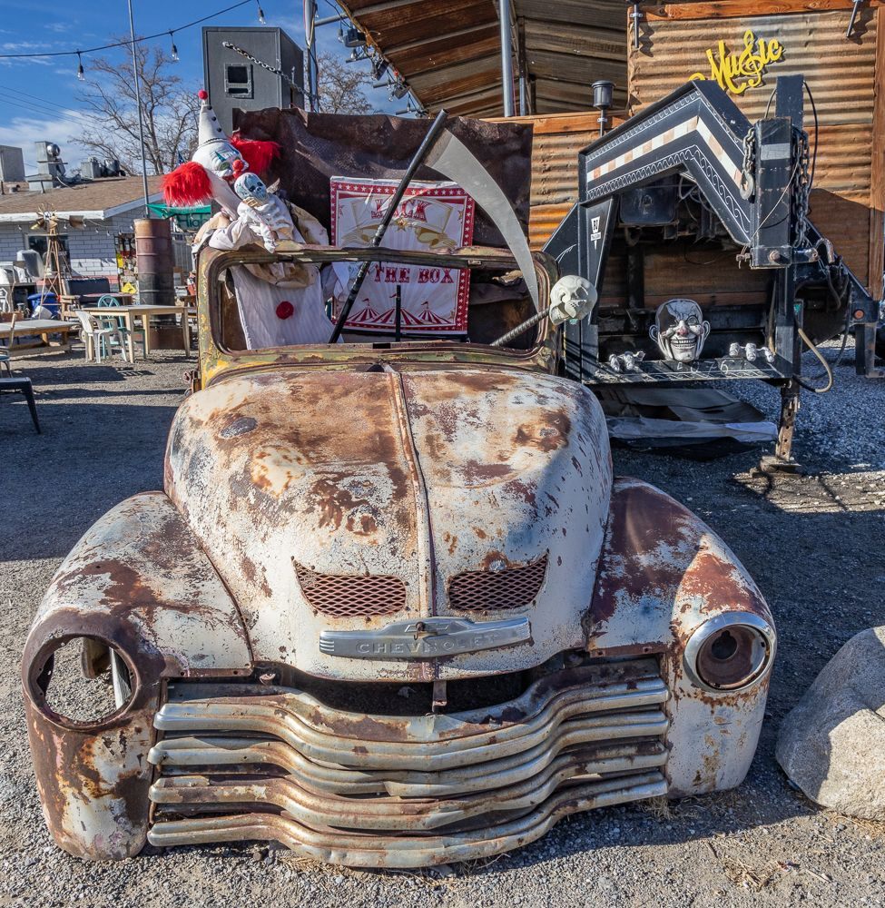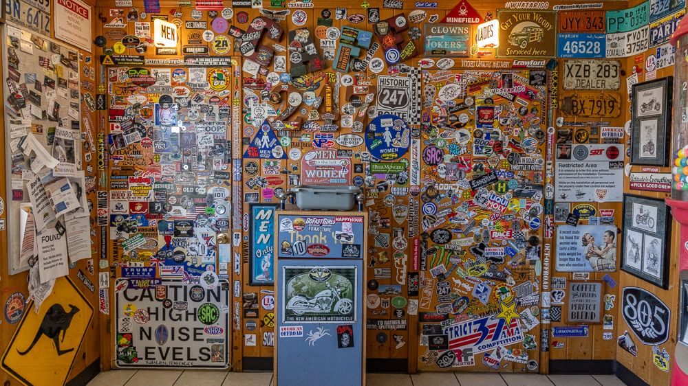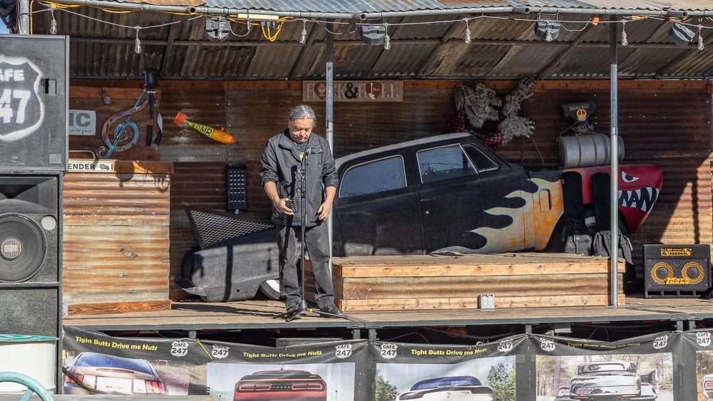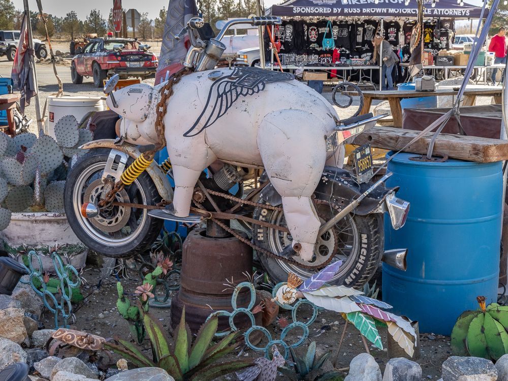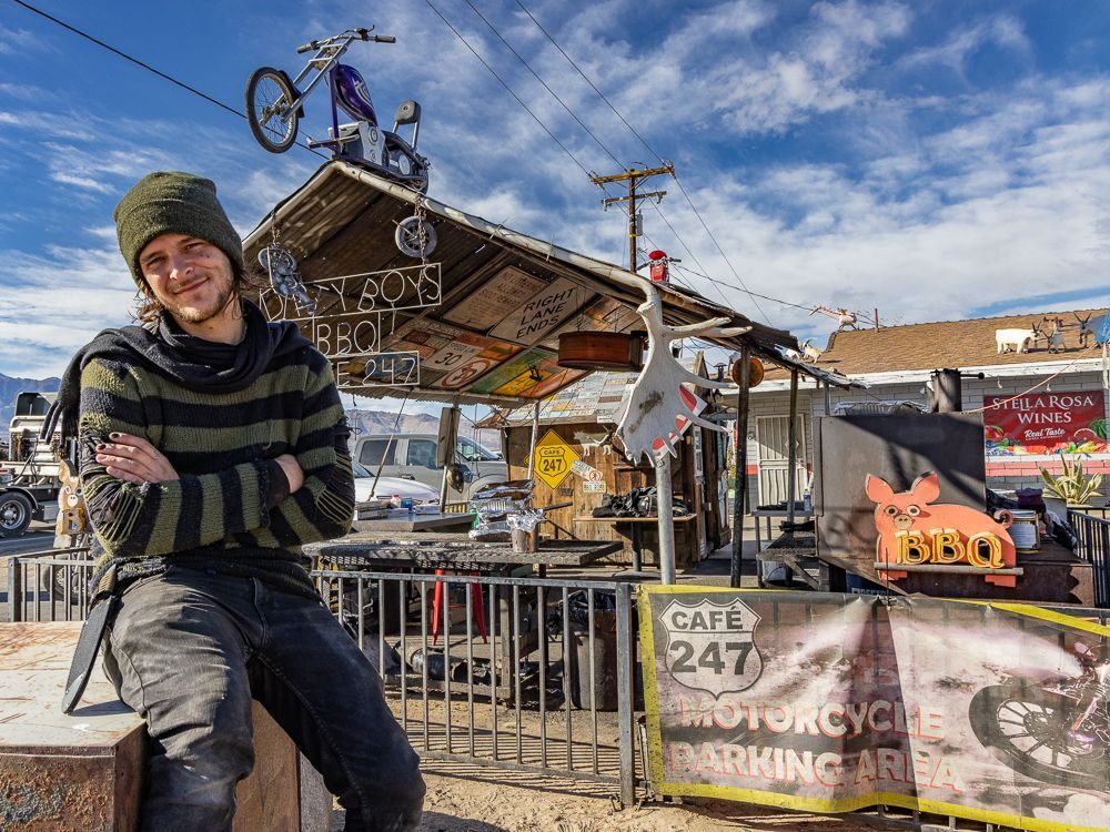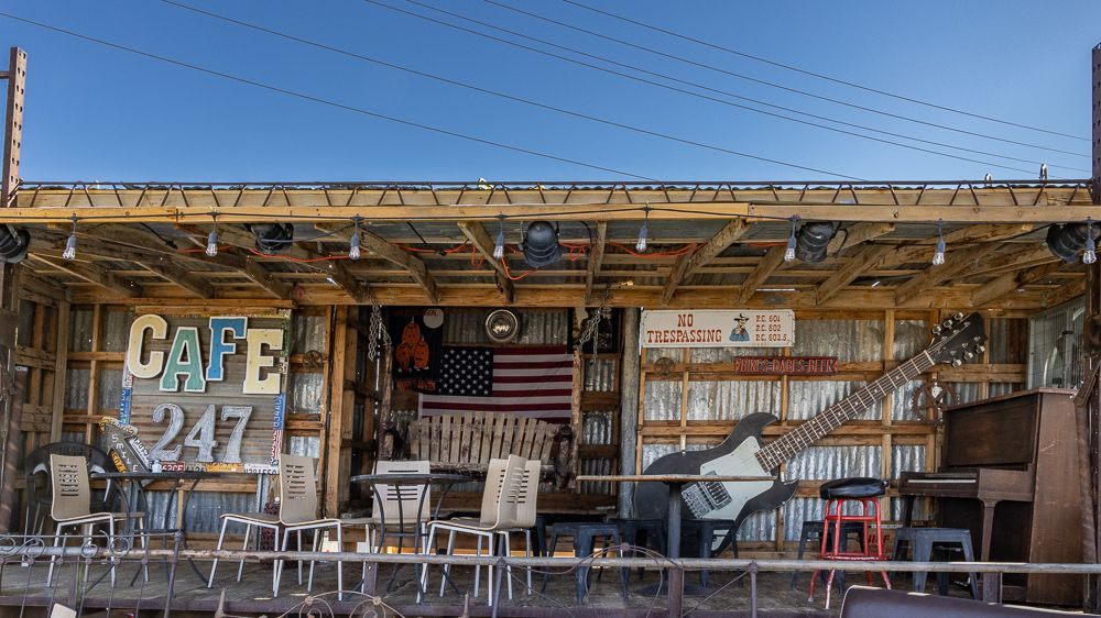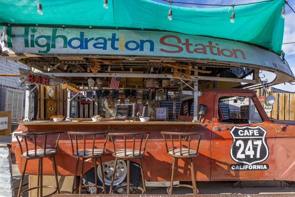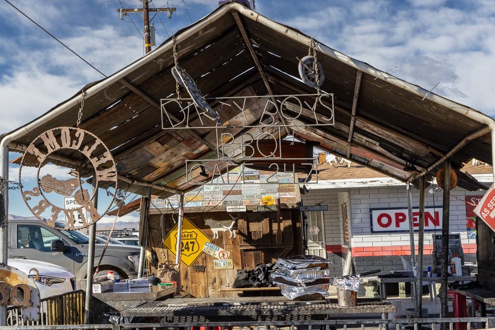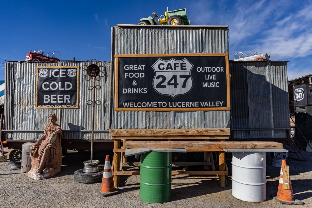 Then, at the corner of Old Woman Springs Road and Hwy 247 I found Cafe 247 . This one-time doctor’s office had become a biker themed BBQ joint that also features outdoor music on several stages and all sorts of funky art installations. It is currently owned by Kathy and Alyn Nelson.