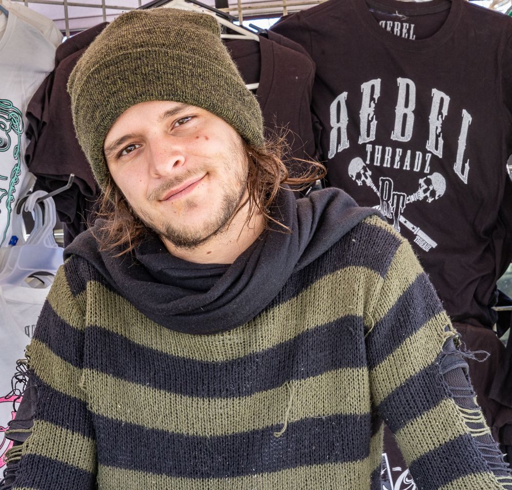 I thought I would at least have to leave California to find folks who had a different world view than mine. I chatted with Joe, behind the Hydration Station (AKA bar). He explained that the portable stages were frequently hooked up to trailers and stolen, and that the local police would fine the cafe for the theft, as well as for playing music at all (he said they have a license). He also told me that he also owns a distillery, and that the “Newsom’s communist, liberal democrats” would double charge him for his license. I just listened and asked questions. I also chatted with Ezra at the T-shirt stand. He was just a cool dude.