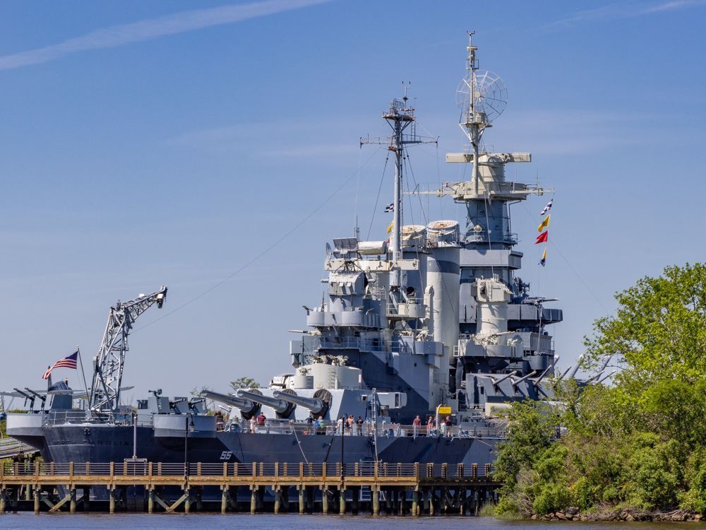 Battleship North Carolina , parked on the river. Reputedly the most highly decorated American battleship of World War II.
