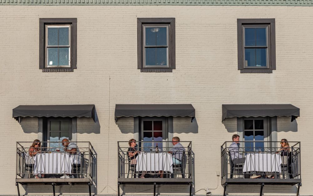 Diners enjoying dinner alfresco on balconies overlooking the river