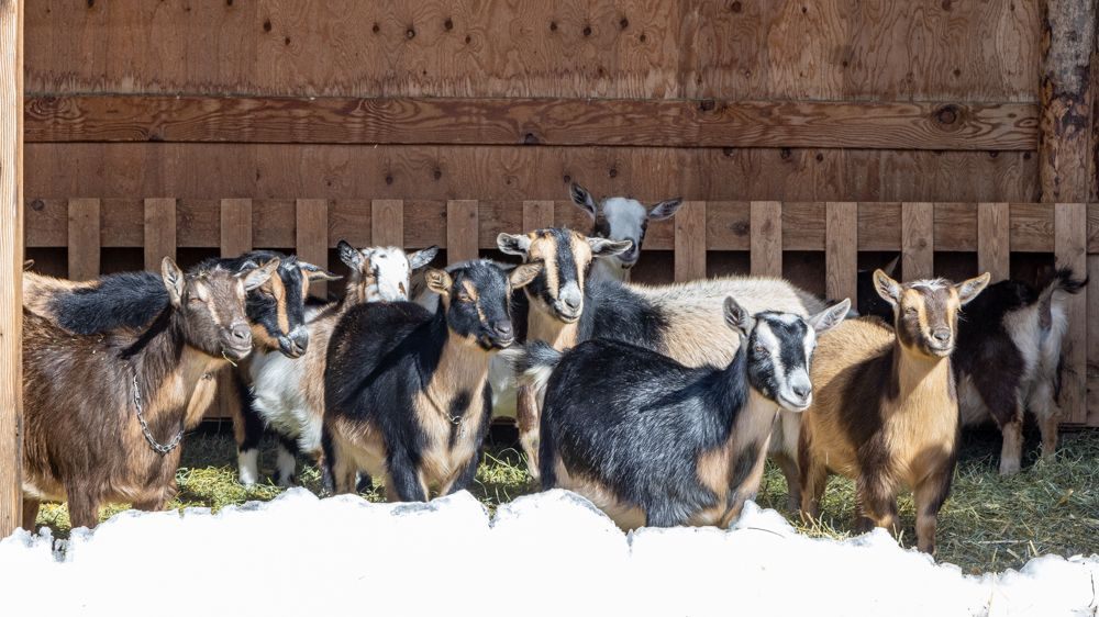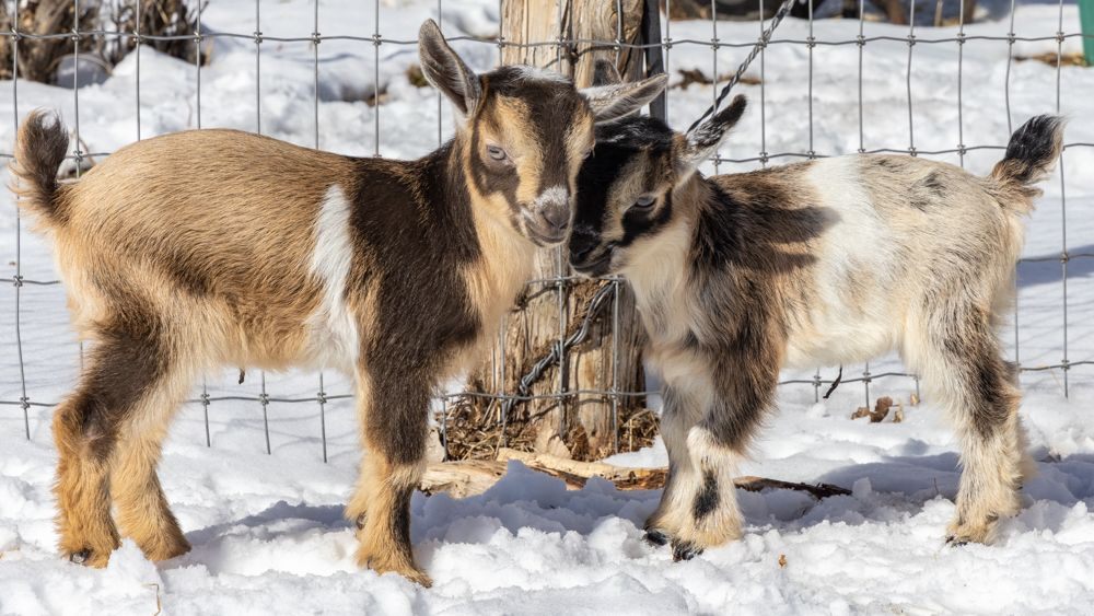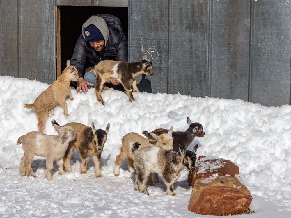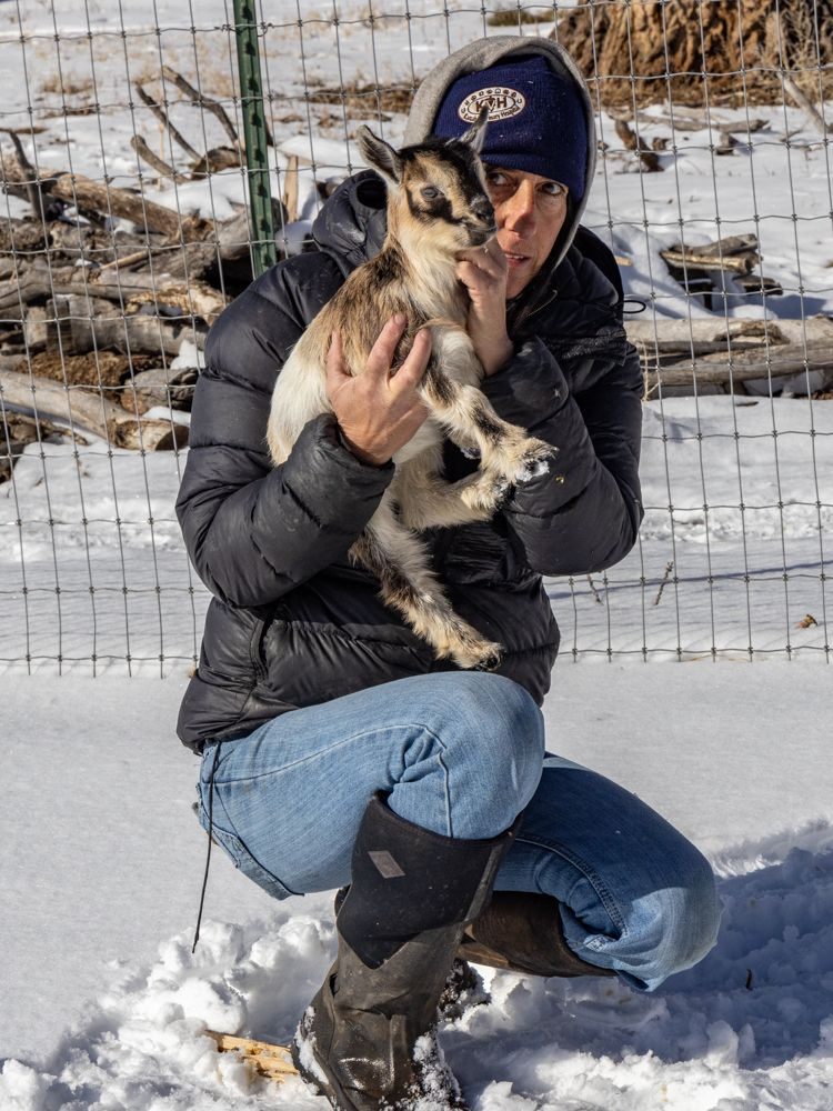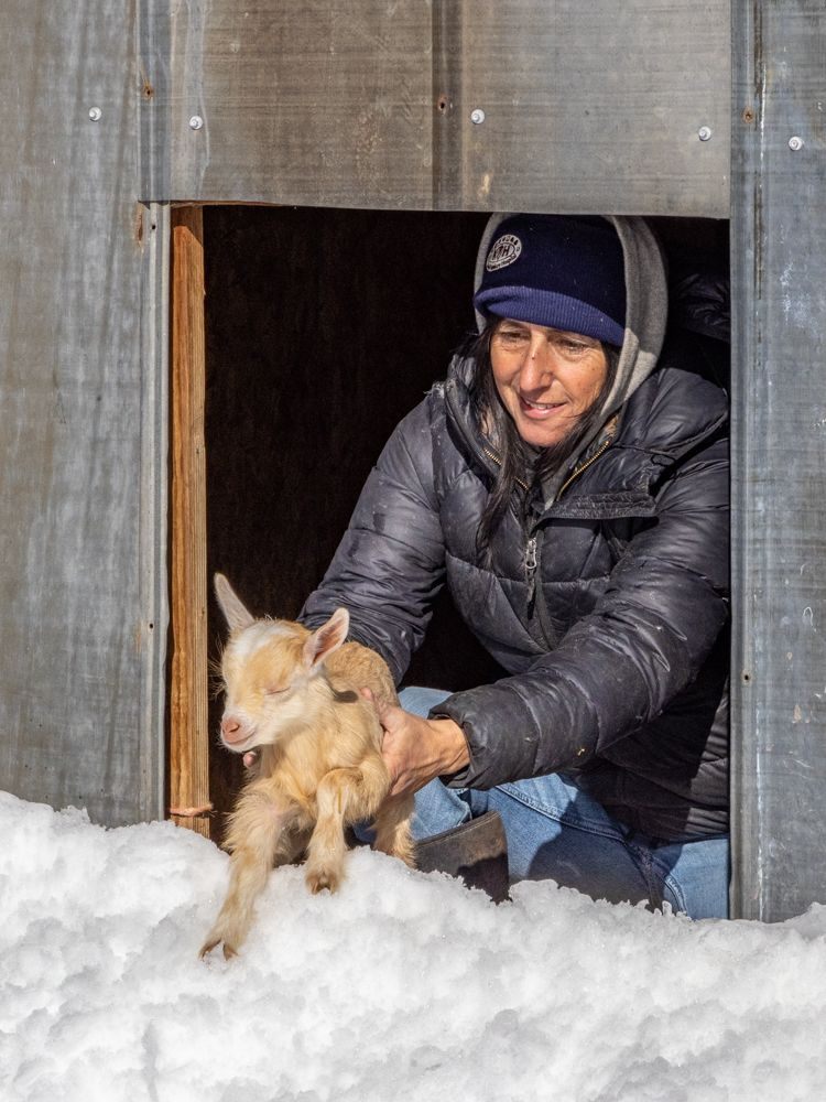 The goats themselves were also a revelation. Very sweet and friendly. And the barn smelled only of grass and hay (as did I after the visit!), but again, not of goat or manure or anything else I might have expected. Alexis explained that they are very clean and quite picky about their food and environment. Of course I fell in love with the kids, only a few weeks old! Alexis put them out to experience their first time in the snow.